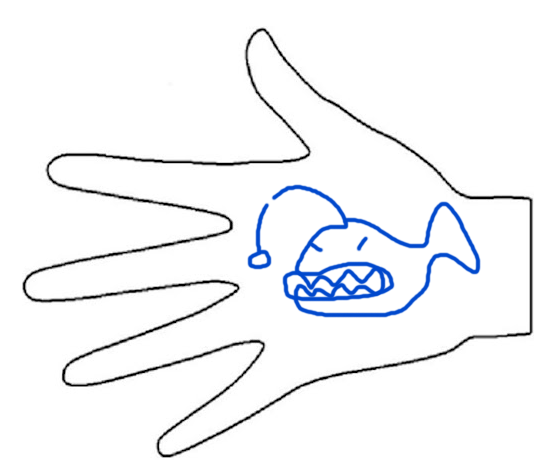 [ And, while the ink is still wet, they reach over and takes Amami's hand, turning it over so they can press the back of their hand firmly against his, stamping the anglerfish onto his skin. ]